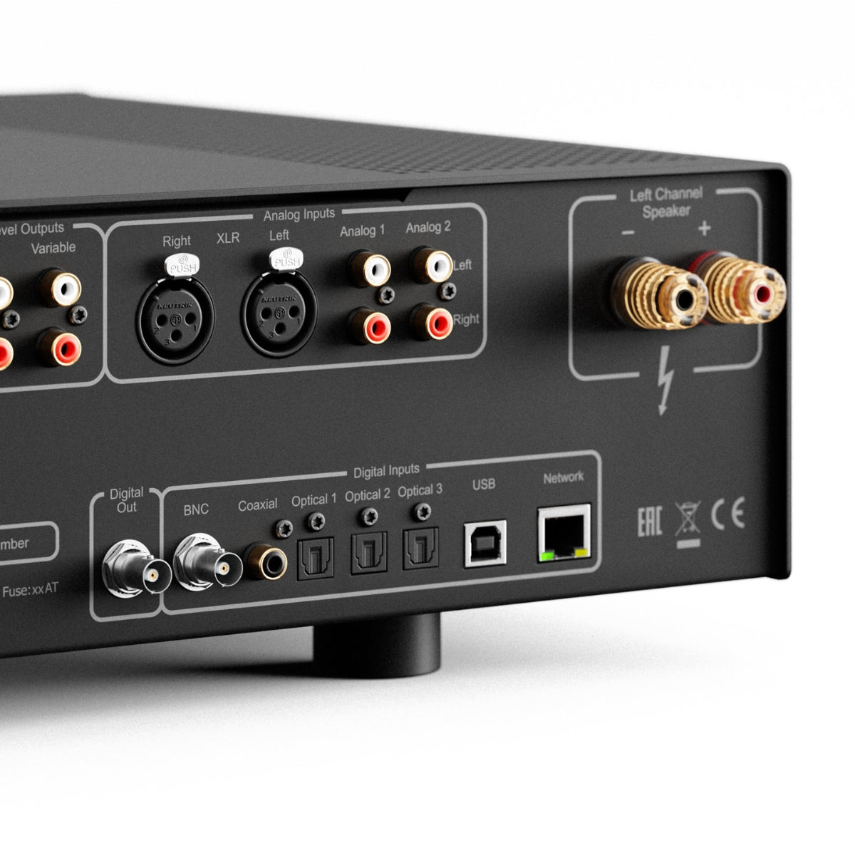 | Digital Inputs: | 1 x coaxial (BNC, S/PDIF 24/192, DSD64 (DoP), MQA 8x), 1 x coaxial (RCA, S/PDIF 24/192, DSD64 (DoP), MQA 8x), 3 x optical (S/PDIF 24/96, MQA 8x), 1 x USB (32/384, DSD256 (DoP), MQA 8x, 1 x Network (24/192, DSD64 (DoP), MQA 8x) |